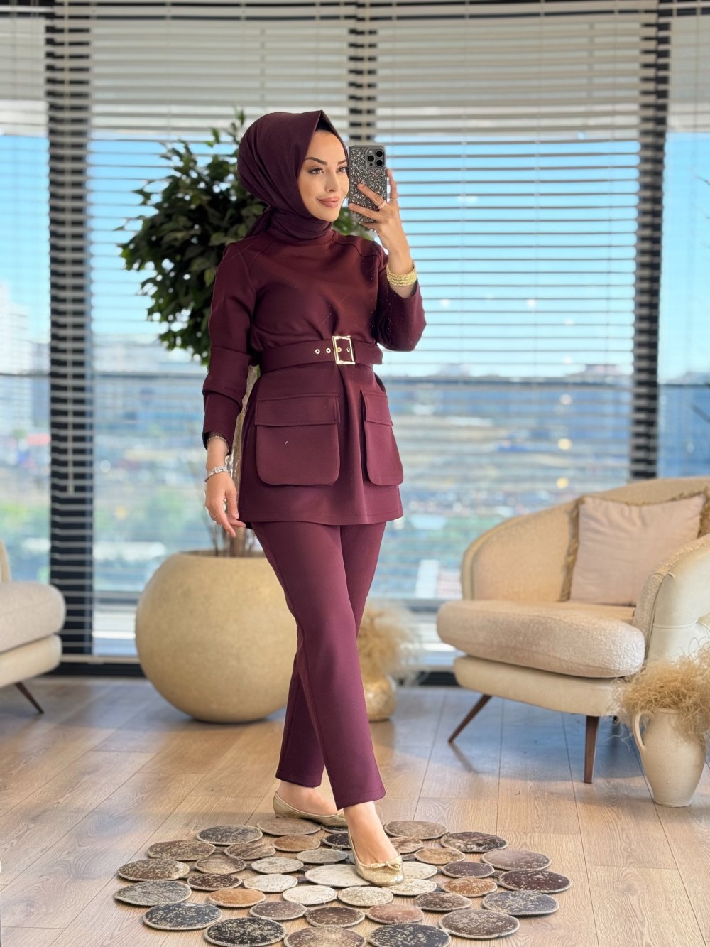 8566 Ön İki Cepli Kemerli Takım Bordo