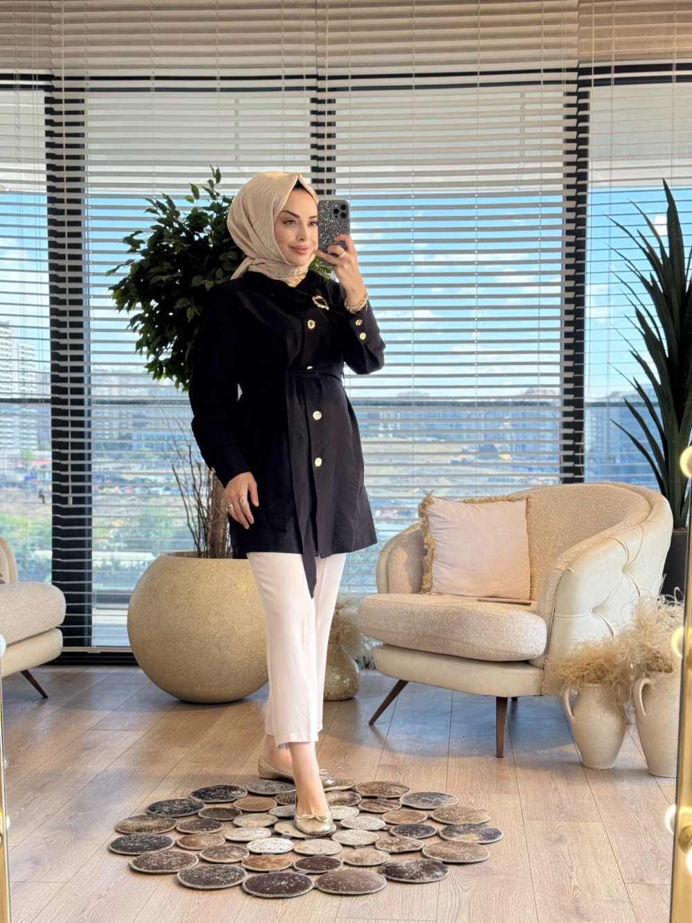 9265 Yaka Broşlu Kuşaklı Kap Siyah