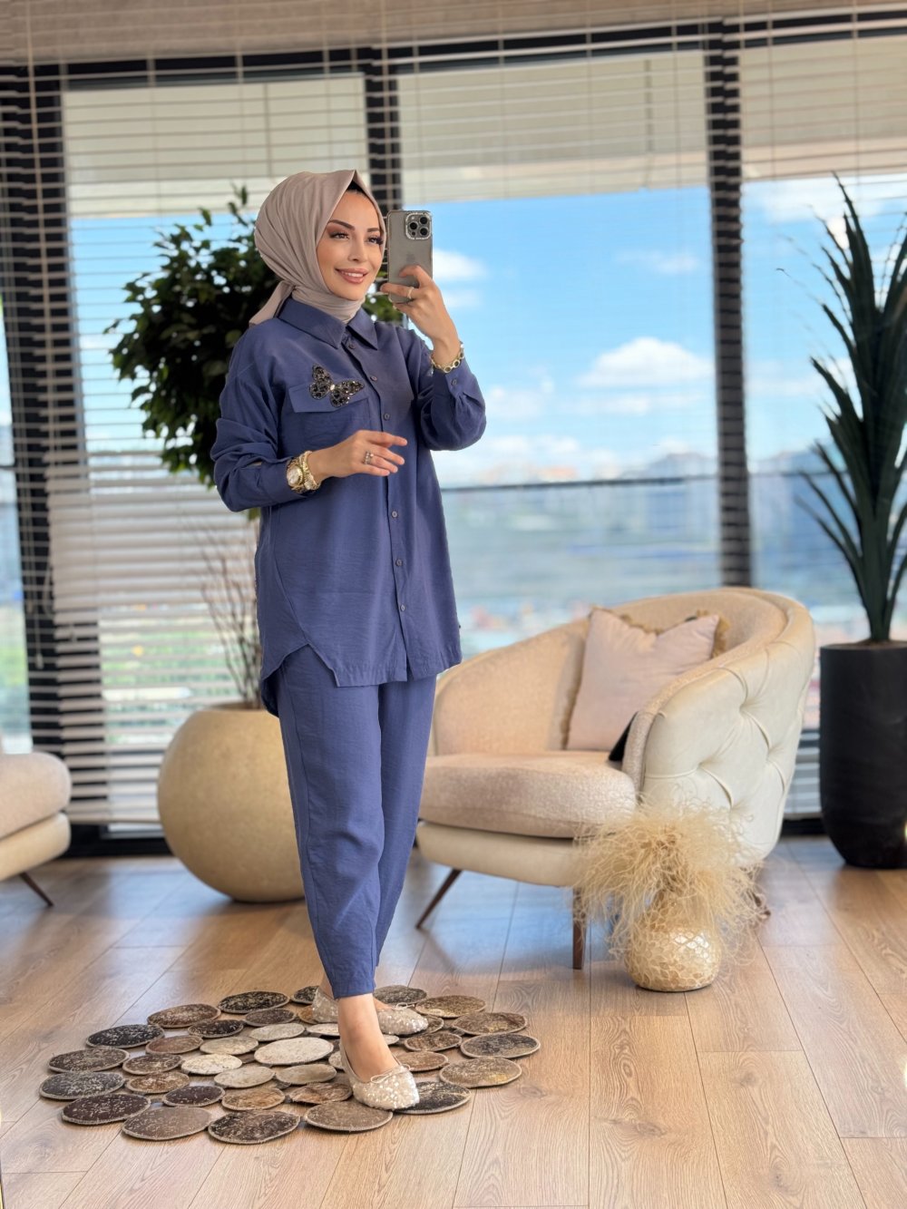 9758 Cebi Kelebek Broş İşli Takım İndigo
