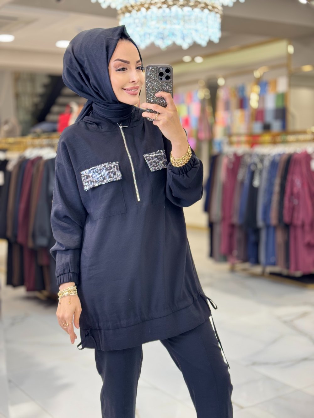 9766 Cep Kapağı Payetli Kapşonlu Takım Siyah