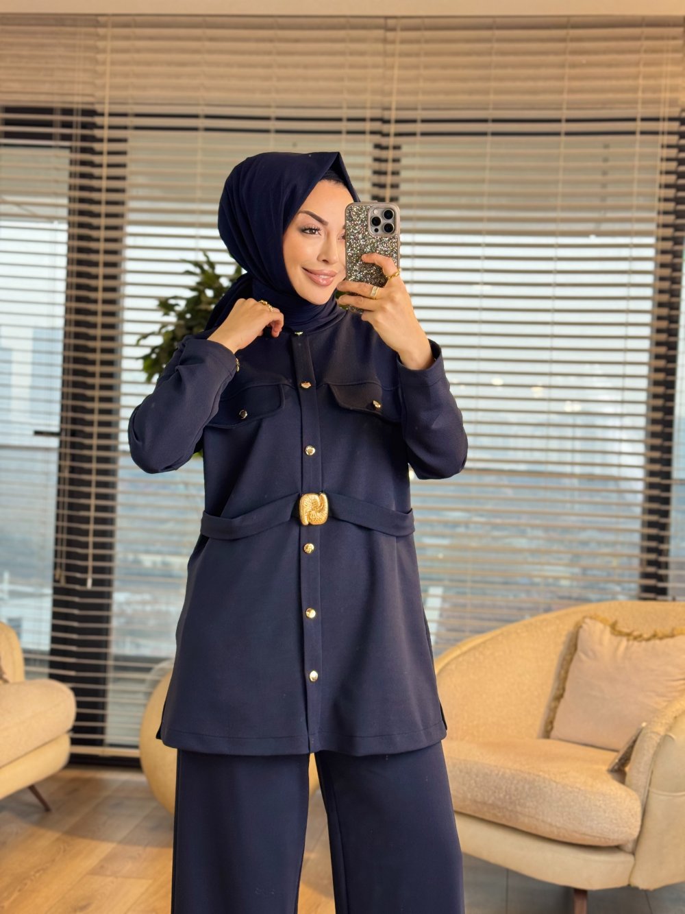 9830 Ön İki Cepli Beli Kemerli Pantolon Lacivert