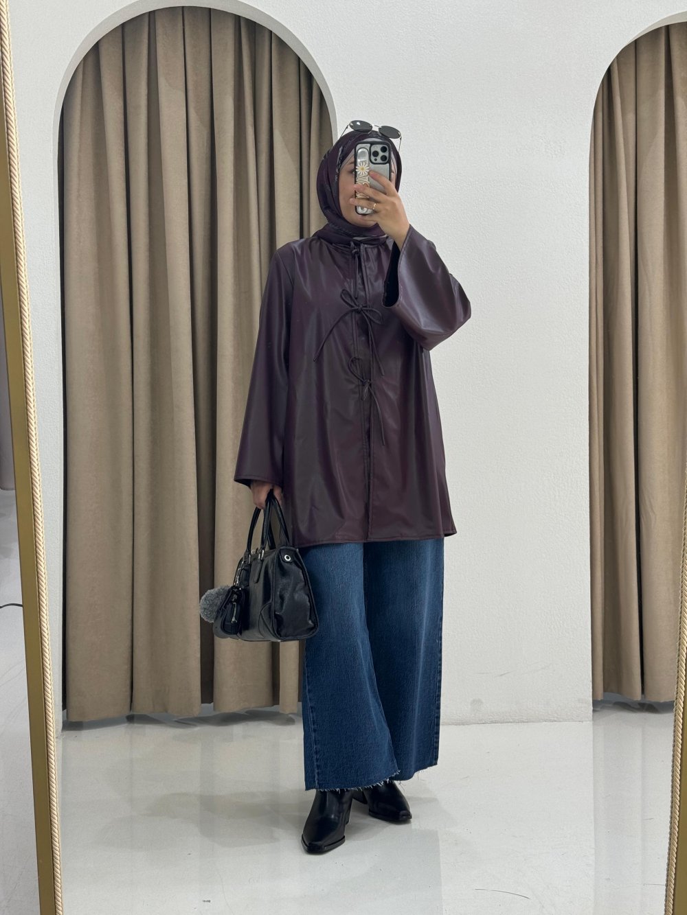 Bağlama Detaylı Uzun Deri Ceket Mürdüm
