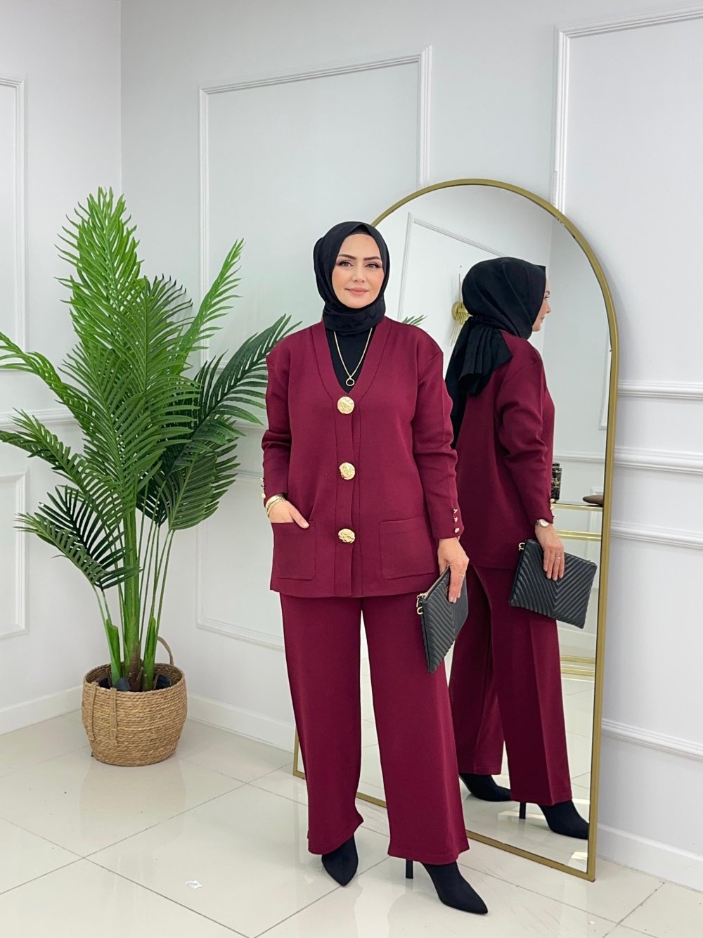 Merserize kumaşın asil duruşu, gold detayların zarafetiyle buluştu.