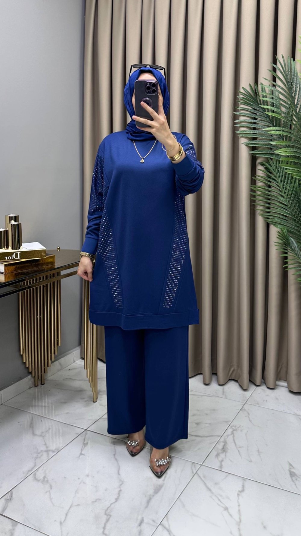 Hanımeli Taşlı Takım İndigo Mavi