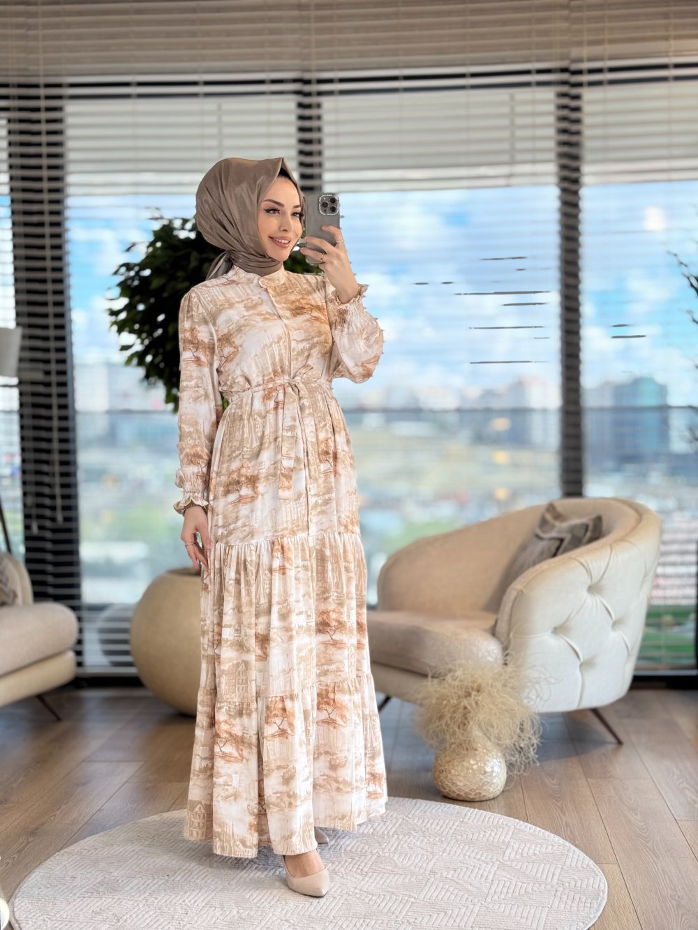 MRW1332 Summer Gemi Desenli Elbise Bej