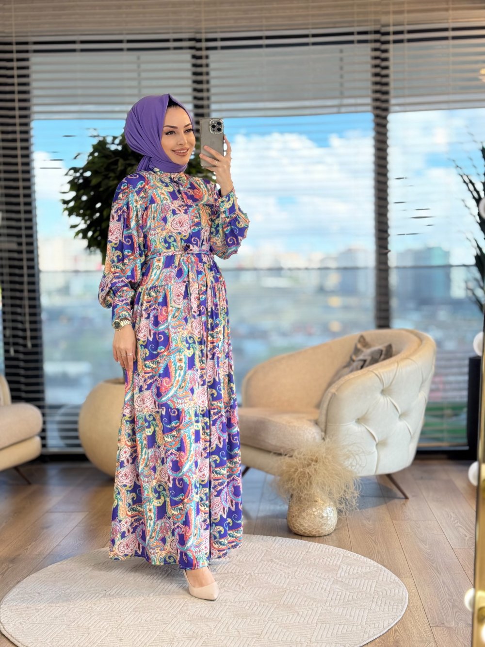 MRW1371 Fas Ethnic Desenli Elbise Mor