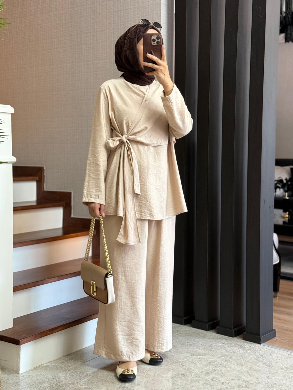 Doğal Dokusu Ve Dengeli Siluetiyle : Önden Bağlama Detaylı Pantolon Takım?