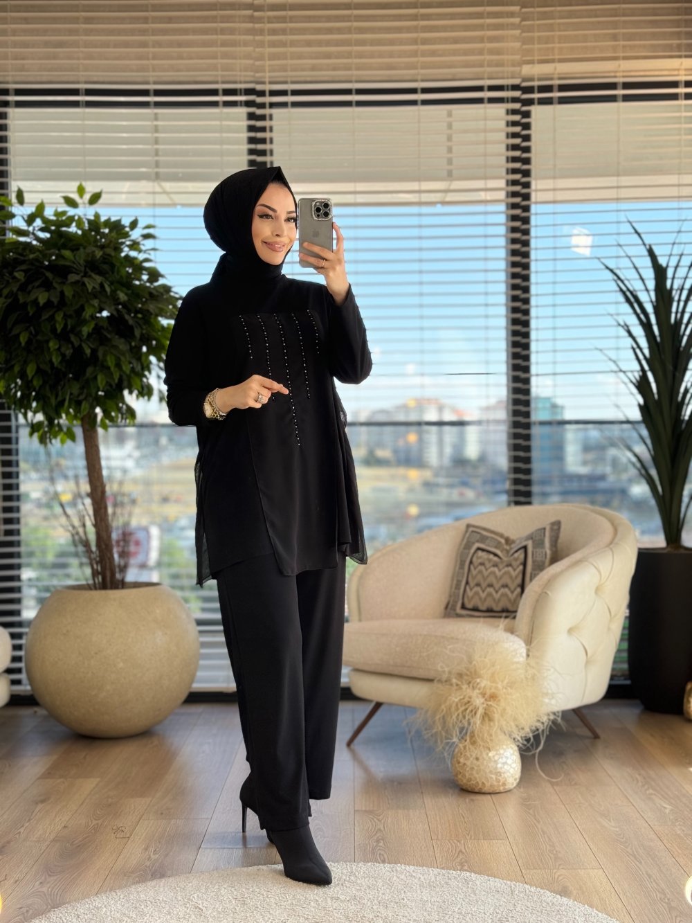 W5968 Şifon Garni Boncuk İşlemeli Takım Siyah
